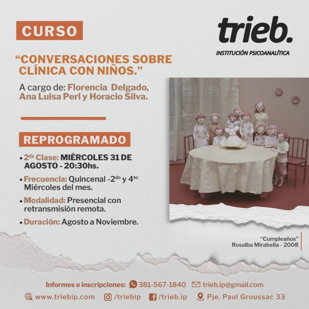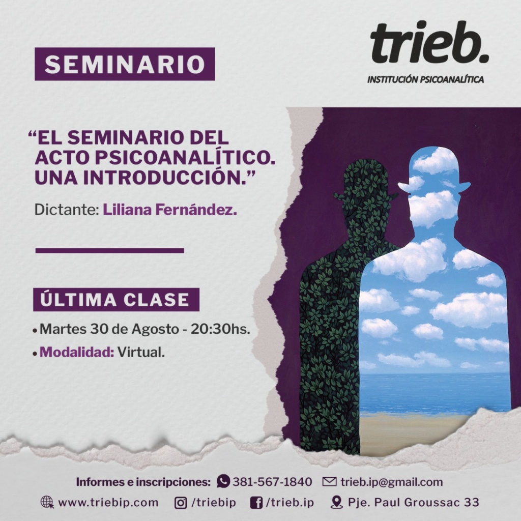 Trieb - Institución Psicoanalítica Integrante de Convergencia, Movimiento Lacaniano por el Psicoanálisis Freudiano. Sobre nosotros Noticias «El Seminario del Acto Psicoanalítico. Una introducción » Última clase martes 30 de agosto - 20:30 hs.✅ Modalidad: Virtual Más información e inscripción:📧 trieb.ip@gmail.com📱3815671840 ¡Los esperamos! Curso » Conversaciones sobre clínica con niños» Dictante: Florencia Delgado, Ana Luisa Perl y Horacio Silva. 2da Clase REPROGRAMADA: Miércoles 31 de agosto. 20.30 hs ✅ Modalidad: Seminario: «Sexualidad-Sexuación, puntuaciones sobre el Seminario XX de J.Lacan». – Última clase Jueves 25/08/22 a las 20,30hs. ✅Modalidad: Presencial únicamente. Con el deseo de compartir estas cuestiones teórico clínicas que nos interpelan, SEMINARIO INTRODUCTORIO: «Inhibición, síntoma y angustia» – 9na Clase 🗓️ Martes 23 de agosto 20.30 hs.📌 Modalidad: PRESENCIAL y por zoom. En esta clase les propongo trabajar un tema CURSO: “El Amor en los tiempos de la Adolescencia” – 2da Clase Dictante: María Eugenia Gutiérrez. 🗓️ 2da Clase: Jueves 18 de Agosto - 14:30 hs. ✅ Modalidad: VIRTUAL. 📌 Frecuencia: 1er «El Seminario del Acto Psicoanalítico. Una introducción » – 4to encuentro Dictante : Liliana Fernández🗓️ Clase martes 16 de agosto - 20:30 hs.📌 Frecuencia quincenal: 1 y 3 martes del mes « Anterior 1 … 25 26 27 28 29 … 46 Siguiente » Contacto Por favor, activa JavaScript en tu navegador para completar este formulario.Nombre *NombreApellidosCorreo electrónico *Comentario o mensaje *Opciones múltiplesConsultaInscripciónCommentEnviar