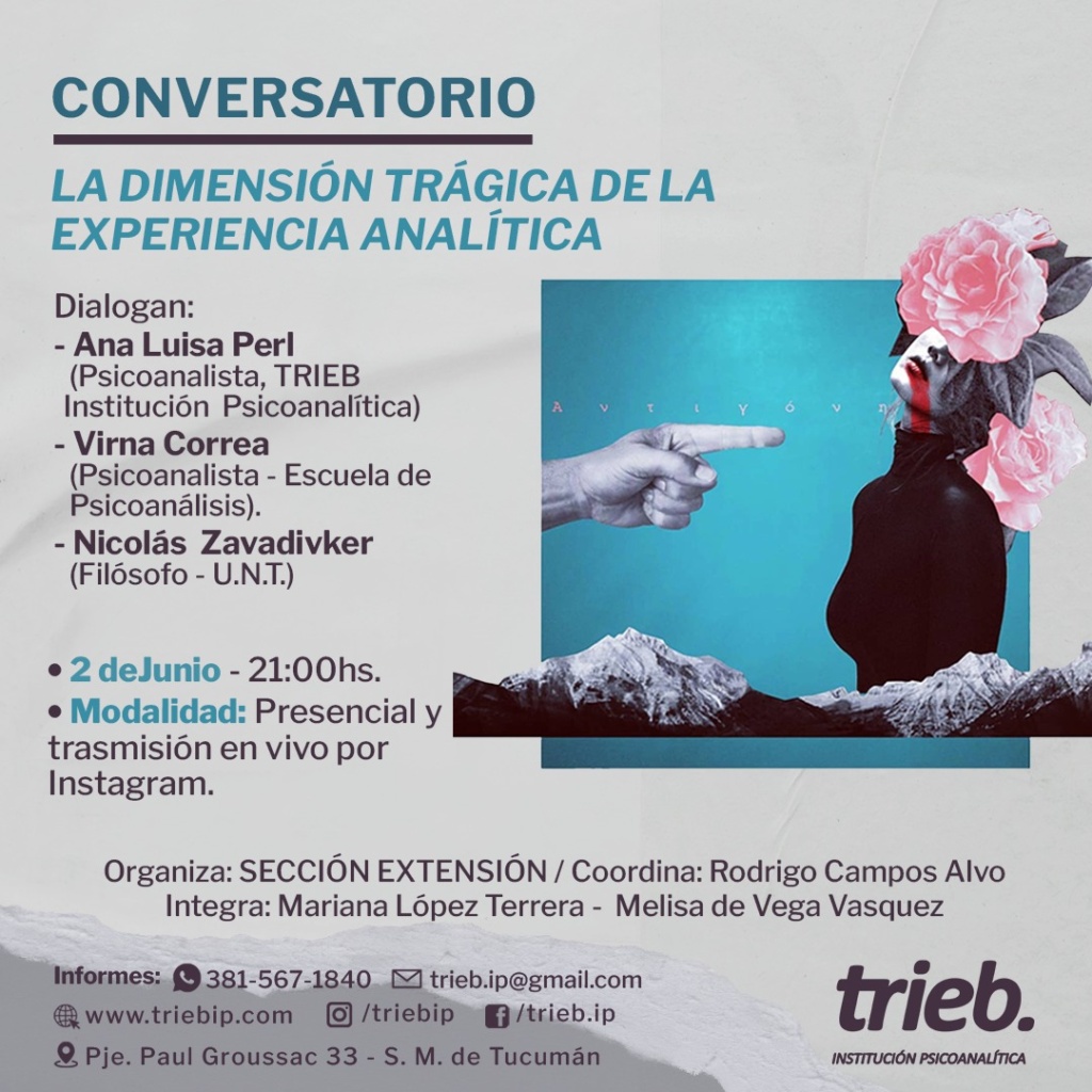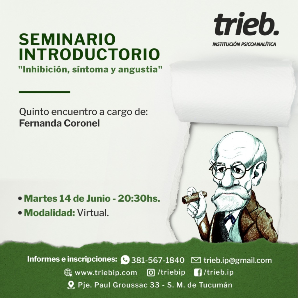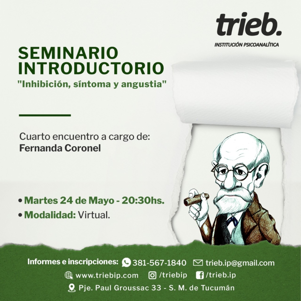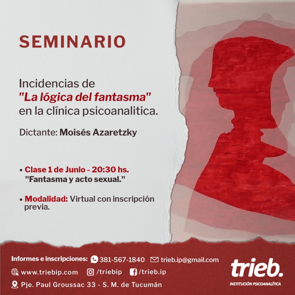Trieb - Institución Psicoanalítica Integrante de Convergencia, Movimiento Lacaniano por el Psicoanálisis Freudiano. Sobre nosotros Noticias Última clase del SEMINARIO: Incidencias de «La lógica del fantasma» en la clínica psicoanalítica. "Fantasma y acto sexual" 15 de junio, 20.30 hs.Modalidad Virtual Bibliografía:J. Lacan "Seminario La lógica del fantasma". Clases 1/3/67, 8/3/67 SEMINARIO INTRODUCTORIO «Inhibición, síntoma y angustia» – 5to Encuentro A cargo de: Fernanda Coronel Martes 14 de junio - 20.30 hsFrecuencia: 2do y 4to martes del mes.Duración: anualModalidad: virtual Seminario: «Sexualidad-Sexuación, puntuaciones sobre el Seminario XX de J.Lacan». 2do Encuentro Jueves 9/06/22 a las 20,30hs.Modalidad mixta (Presencial y por zoom). 2do y 4to Jueves del mes Bibliografía propuesta: clase del 19/12/72 SEMINARIO: Incidencias de «La lógica del fantasma» en la clínica psicoanalítica. Clase 1 de junio, 20.30 hs: "Fantasma y acto sexual" Modalidad Virtual1° y 3° Miércoles del mes- 7 clases. Más Conversatorio: «LA DIMENSIÓN TRÁGICA DE LA EXPERIENCIA ANALÍTICA» Dialogan: Ana Luisa Perl (Psicoanalista -Trieb Institución Psicoanalítica)Virna Correa (Psicoanalista - Escuela de Psicoanálisis)Nicólas Zavadivker (Filósofo - UNT) Jueves 2 Cuarto encuentro del SEMINARIO INTRODUCTORIO «Inhibición, síntoma y angustia» A cargo de: Fernanda Coronel Martes 24 de mayo- 20.30 hsFrecuencia: 2do y 4to martes del mes.Duración: anualModalidad: virtual 📝Mas « Anterior 1 … 28 29 30 31 32 … 46 Siguiente » Contacto Por favor, activa JavaScript en tu navegador para completar este formulario.Nombre *NombreApellidosCorreo electrónico *Comentario o mensaje *Opciones múltiplesConsultaInscripciónWebsiteEnviar