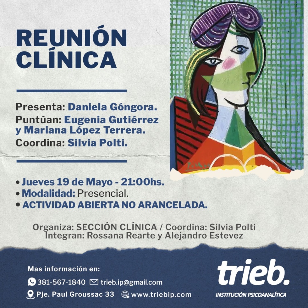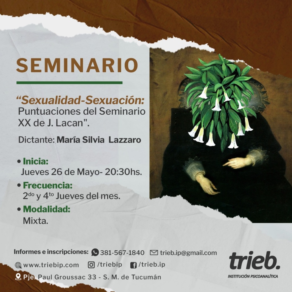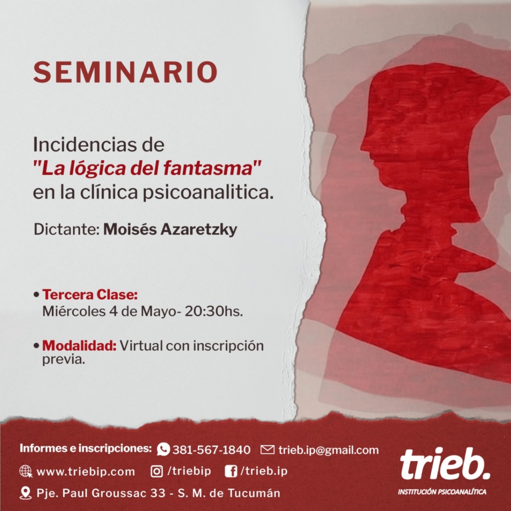 Trieb - Institución Psicoanalítica Integrante de Convergencia, Movimiento Lacaniano por el Psicoanálisis Freudiano. Sobre nosotros Noticias Cuarta clase del SEMINARIO: Incidencias de «La lógica del fantasma» en la clínica psicoanalítica. "Repetición, acting out, pasaje al acto, sublimación"A cargo de: Moisés Azaretzky Miércoles 18 de mayo 20.30 hs Modalidad Virtual1° y SEMINARIO: “Sexualidad-Sexuación: Puntuaciones del Seminario XX de J. Lacan”. Dictante: María Silvia Lazzaro Inicia: Jueves 26 de Mayo -20.30hs Modalidad Mixta 2do y 4to Jueves del mes Más información Reunión Clínica Los invitamos a la Reunión Clínica.🗓 Jueves 19 de mayo - 21.00 hs 📌Presenta: Daniela Góngora📎Puntúan: Eugenia Gutiérrez y Mariana Tercer encuentro del SEMINARIO INTRODUCTORIO «Inhibición, síntoma y angustia» A cargo de: María Eugenia Gutiérrez 🗓️ Martes 10 de Mayo - 20.30 hs📌Frecuencia: 2do y 4to martes del mes.✏️Duración: Tercera clase del SEMINARIO: Incidencias de «La lógica del fantasma» en la clínica psicoanalítica. A cargo de: Moisés Azaretzky 🗓️ 04 de mayo - 20.30 hs💻Modalidad Virtual📖1° y 3° Miércoles del mes - 7 SEMINARIO INTRODUCTORIO «Inhibición, síntoma y angustia» Segundo encuentro a cargo de: María Eugenia Gutiérrez Martes 26 de abril. A las 20.30 hsFrecuencia: 2do y 4to martes « Anterior 1 … 29 30 31 32 33 … 46 Siguiente » Contacto Por favor, activa JavaScript en tu navegador para completar este formulario.Nombre *NombreApellidosCorreo electrónico *Comentario o mensaje *Opciones múltiplesConsultaInscripciónWebsiteEnviar