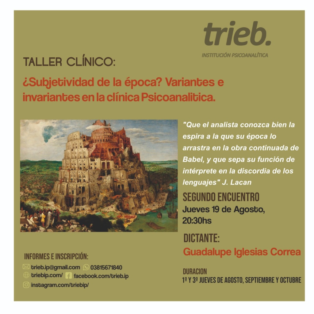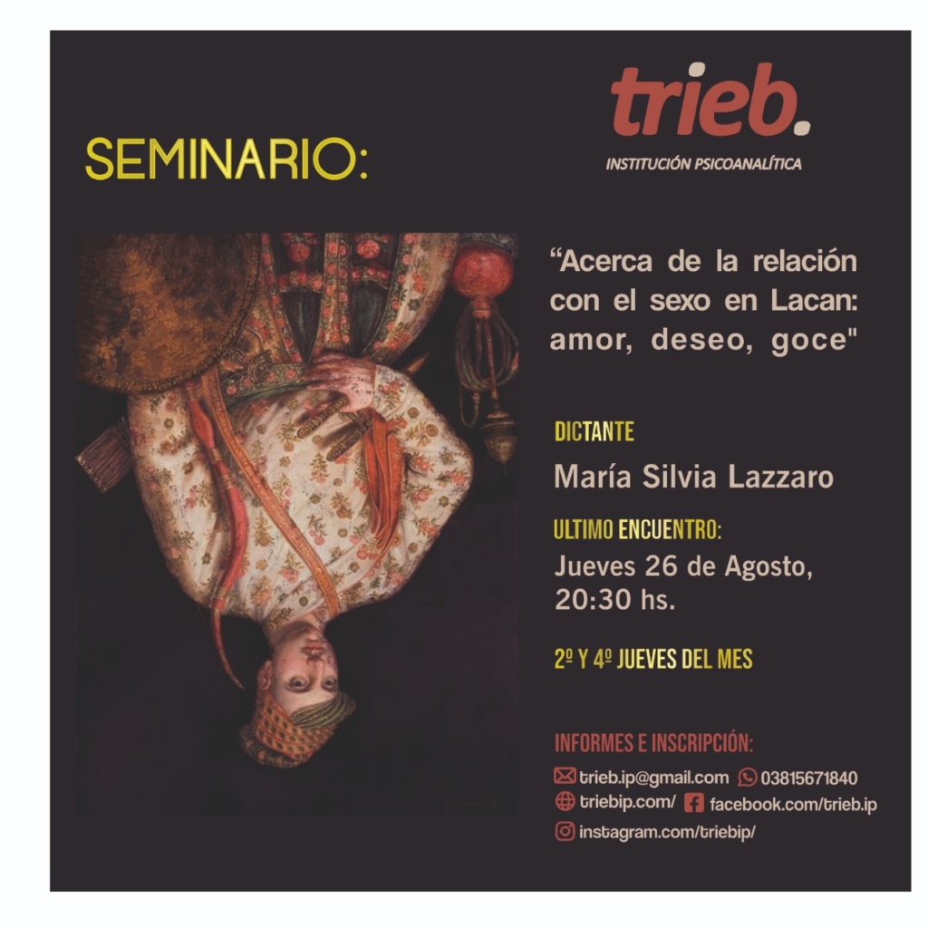 Trieb - Institución Psicoanalítica Integrante de Convergencia, Movimiento Lacaniano por el Psicoanálisis Freudiano. Sobre nosotros Noticias Taller Clínico «¿Subjetividad de la época? Variantes e invariantes en la clínica Psicoanalítica.» "Les diría que la aspiración revolucionaria no tiene otra oportunidad que desembocar, siempre, en el discurso del amo. A lo Seminario Efectos del Nombre-del -Padre: Síntoma y Sinthome. El Martes 31 de Agosto 20:30 horas. A cargo de Liliana Fernández. Seminario «Acerca de la relación con el sexo en Lacan: amor, deseo y goce». El Jueves 26 de agosto a las 20.30 hs. A cargo de María Silvia Lazzaro Curso: Conversaciones sobre clínica con niños. Miercoles 25 de agosto, 20:30 hs Dictante: Horacio Silva. Taller Clínico «¿Subjetividad de la época? Variantes e invariantes en la clínica Psicoanalítica.» A cargo de Guadalupe Iglesias Correa. Jueves 19 de Agosto a 20:30 hs. Seminario Introductorio a la Clínica Psicoanalítica. «El lugar del Otro en la construcción del síntoma analítico» "¿En que dirección se debe trabajar analíticamente la producción mítica?" Martes 17 de Agosto a las 20.30 hs. A cargo « Anterior 1 … 34 35 36 37 38 … 46 Siguiente » Contacto Por favor, activa JavaScript en tu navegador para completar este formulario.Nombre *NombreApellidosCorreo electrónico *Comentario o mensaje *Opciones múltiplesConsultaInscripciónMessageEnviar